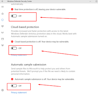9. Selanjutnya ubah on menjadi of pada " Real Time Protection", " Cloud-Based Protection", Otomatic Sample Submission" dan jika ada pop up klik yes.